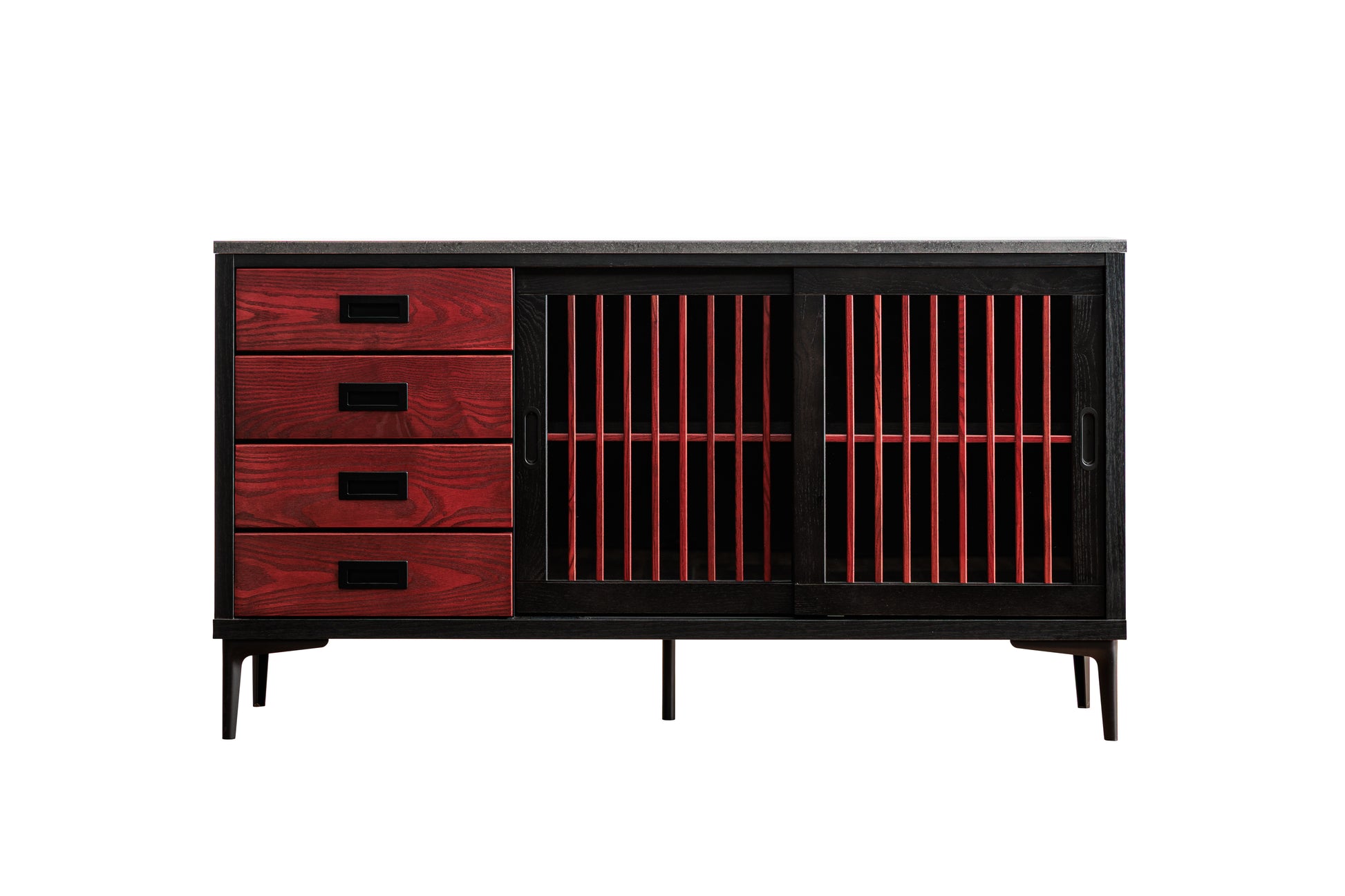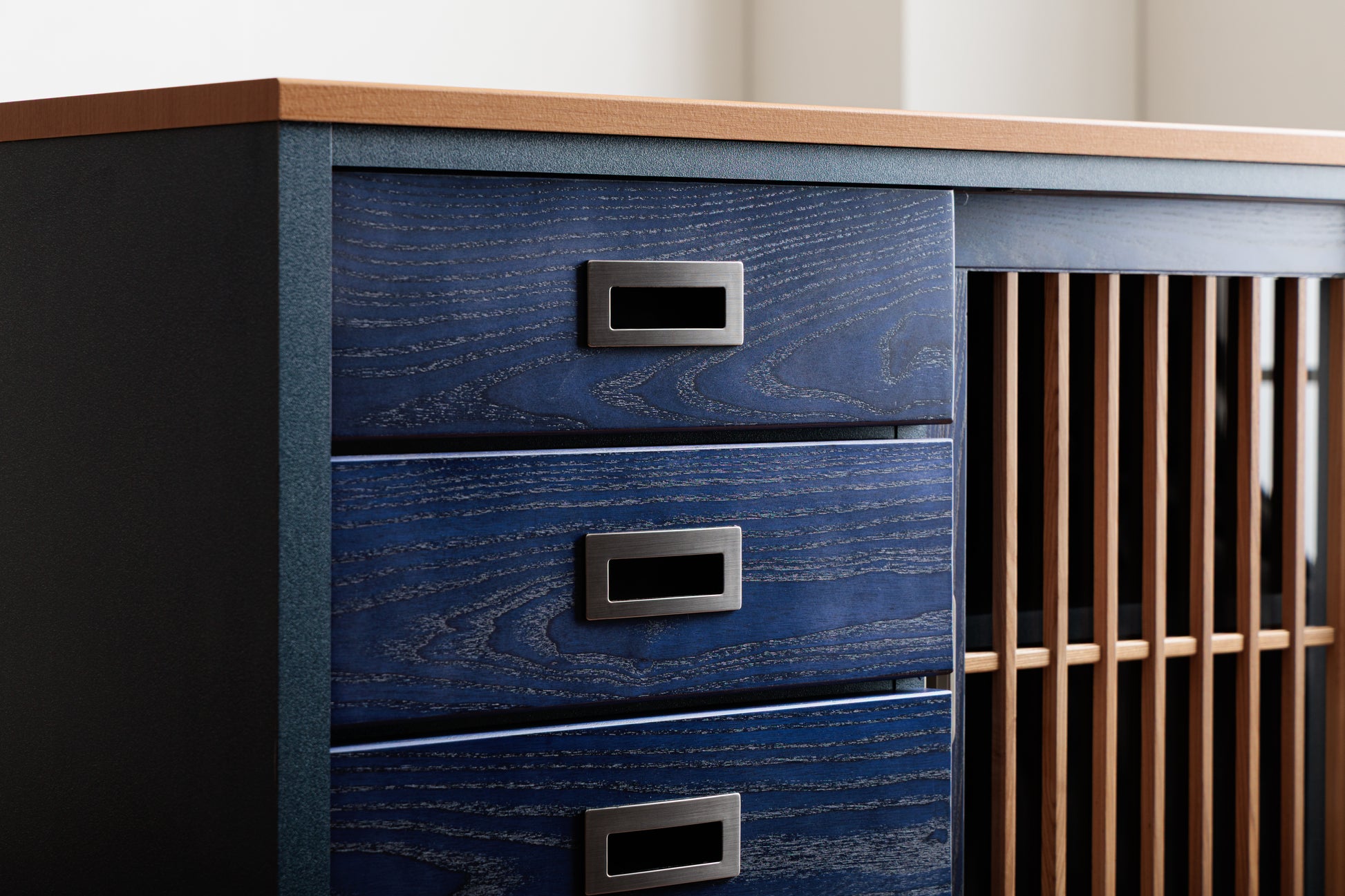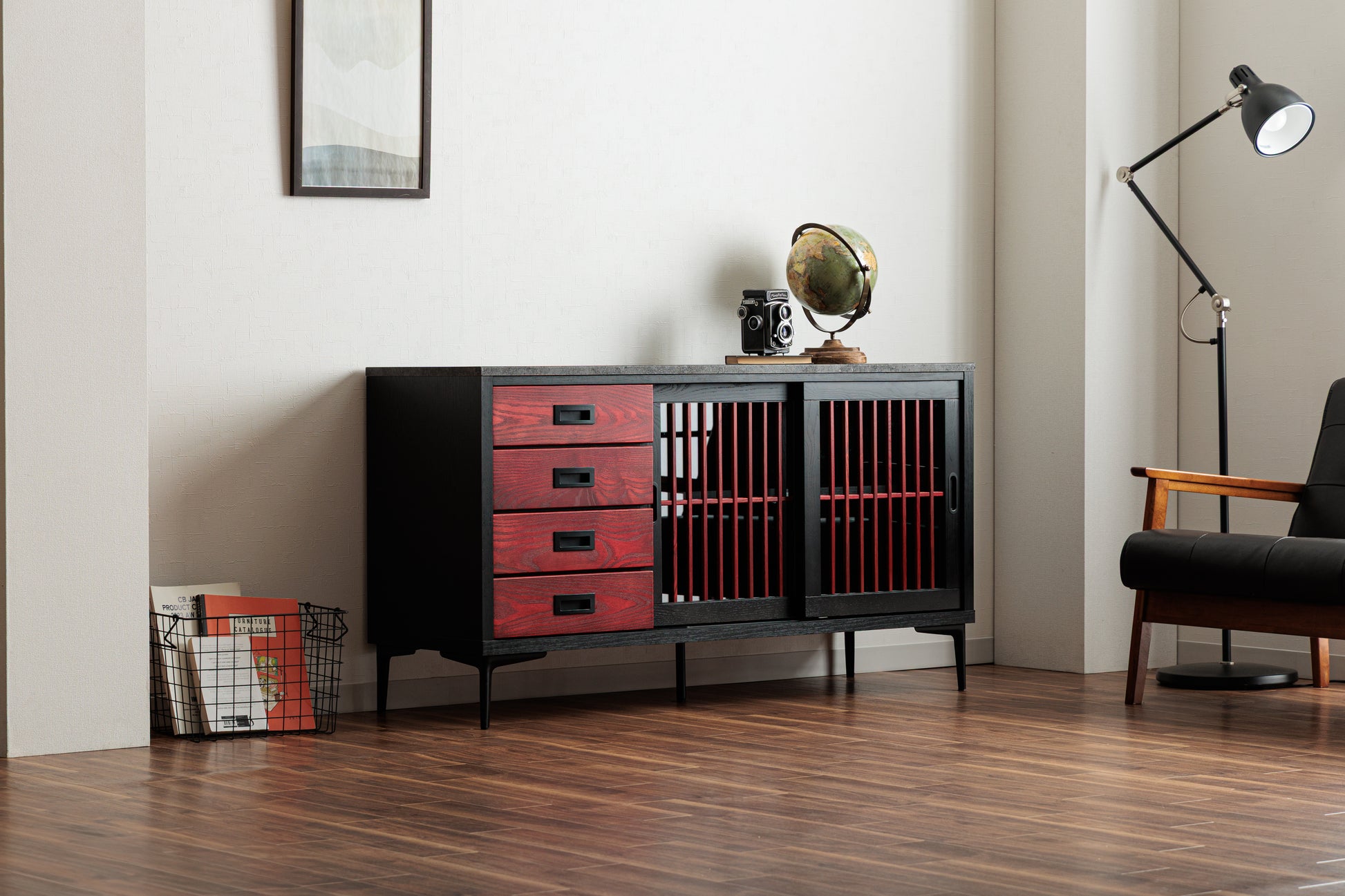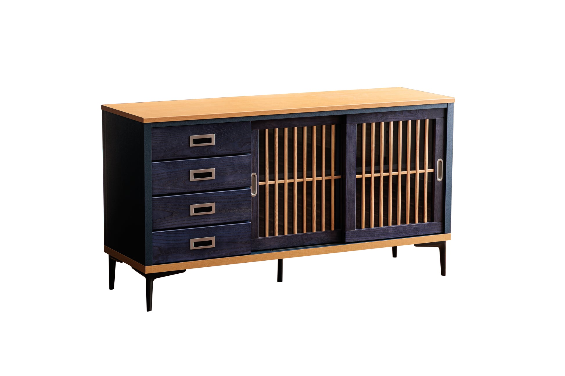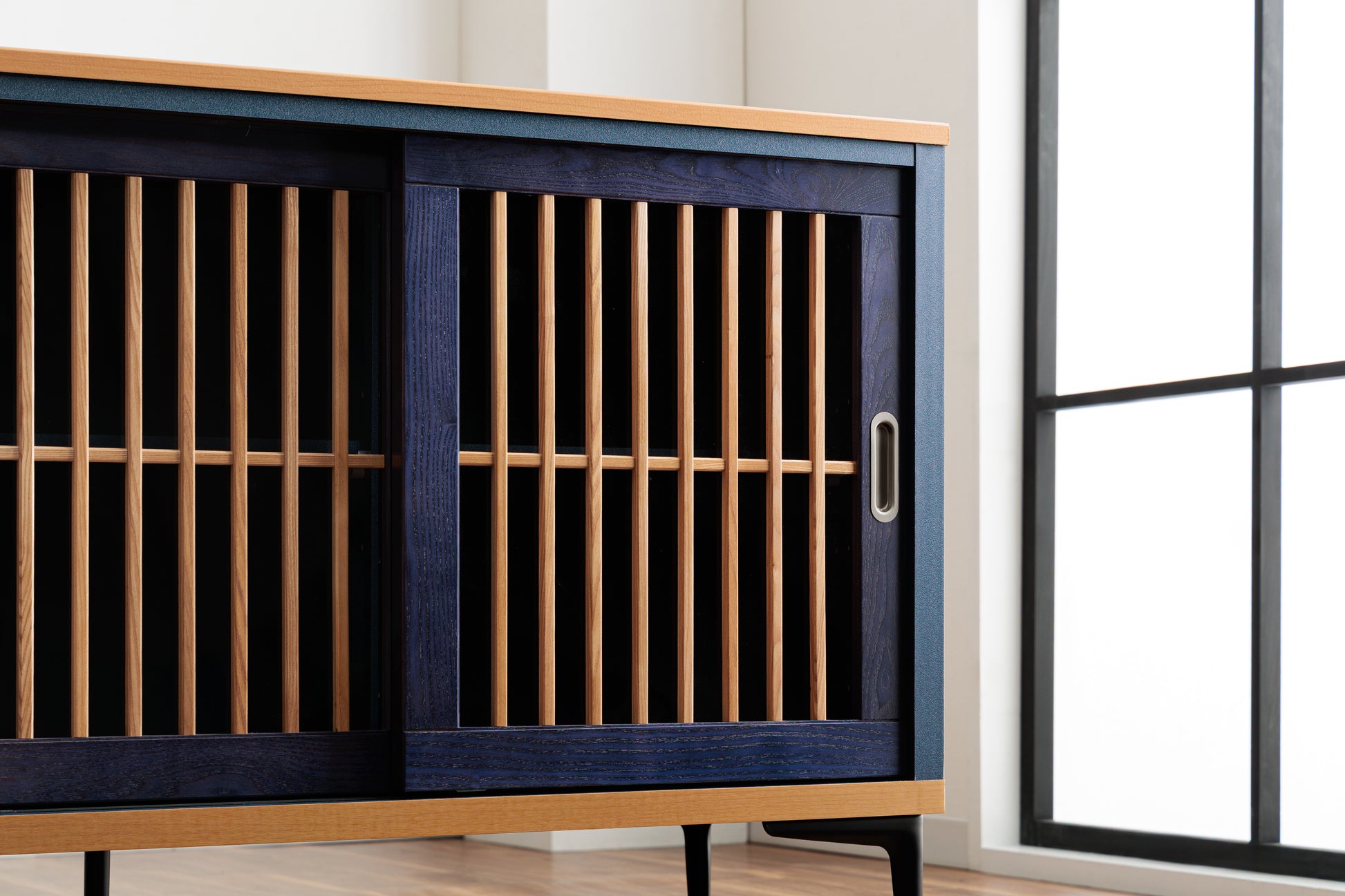 藍色や深紅といった伝統的な日本の色彩を纏い、格子の美しさが際立つ洗練されたサイドボード。