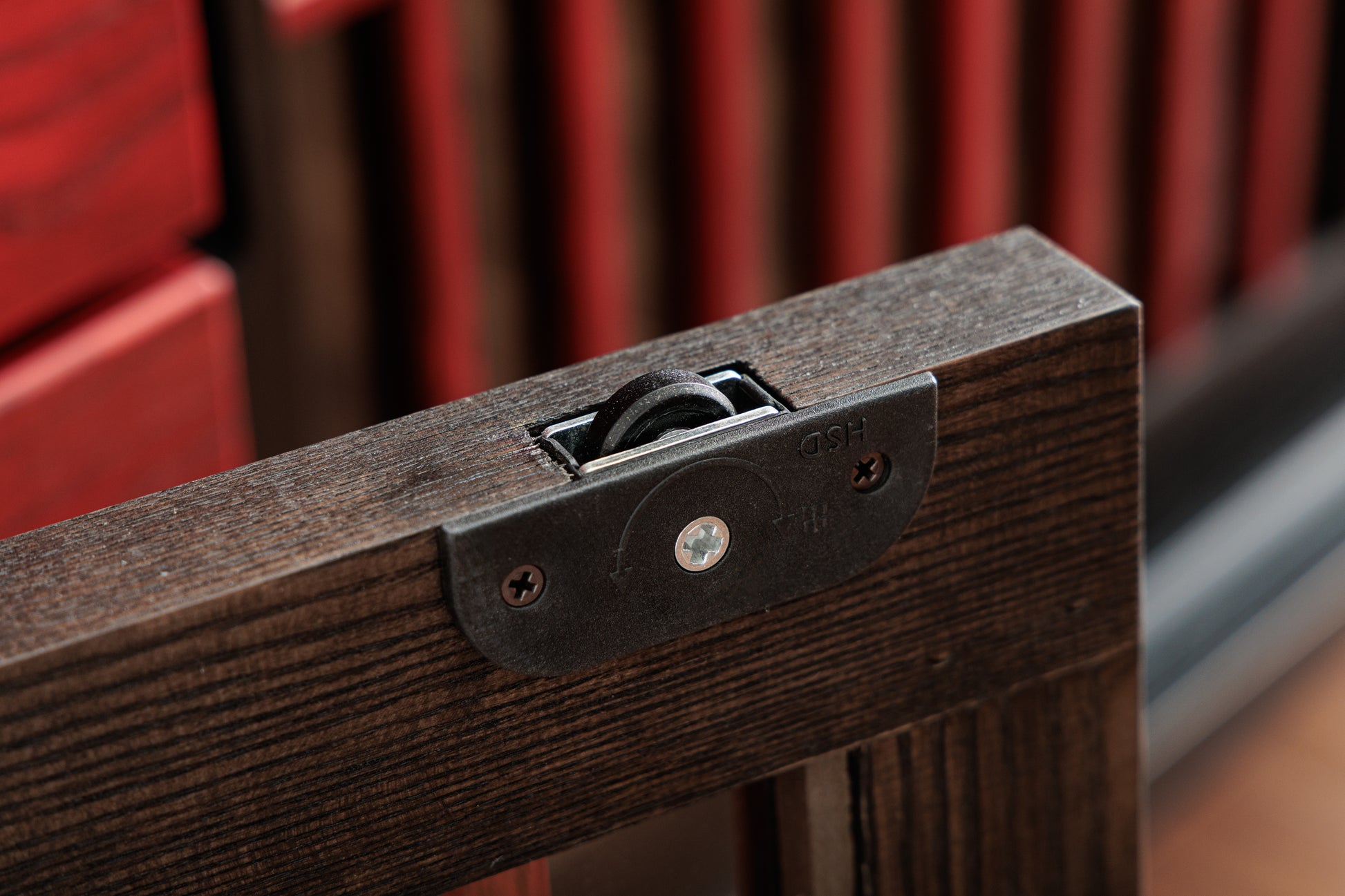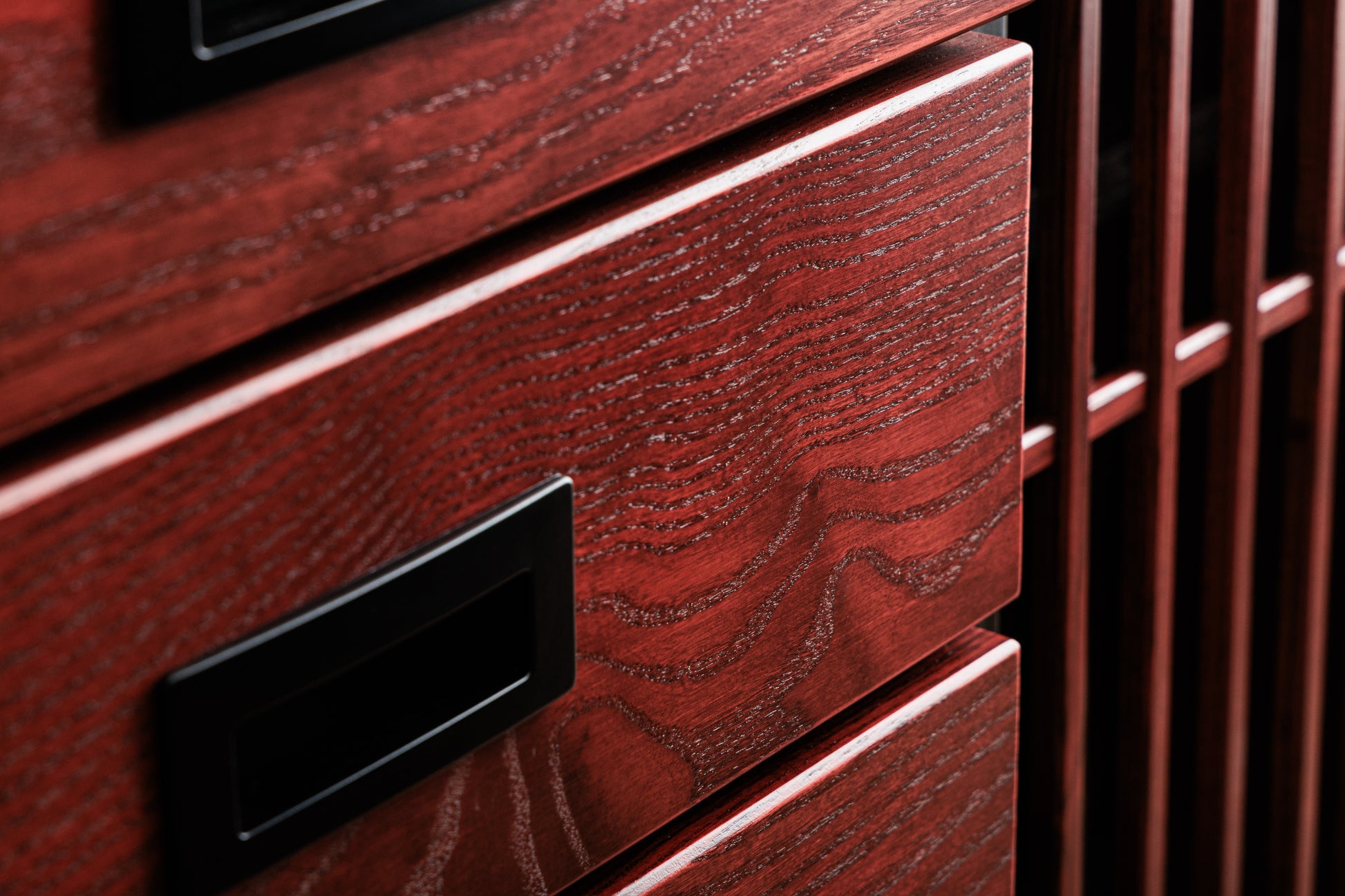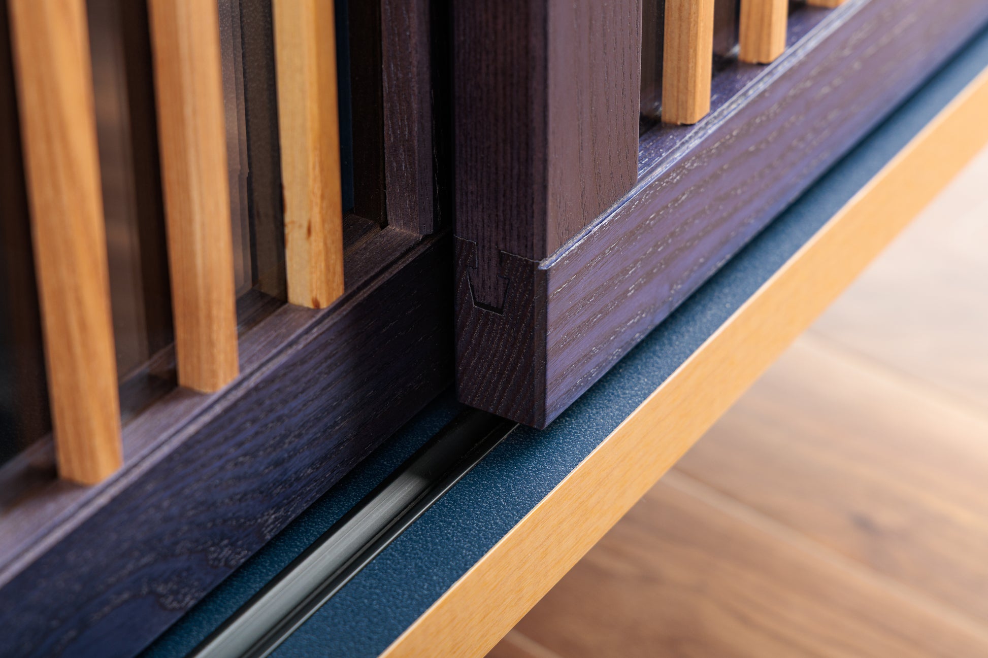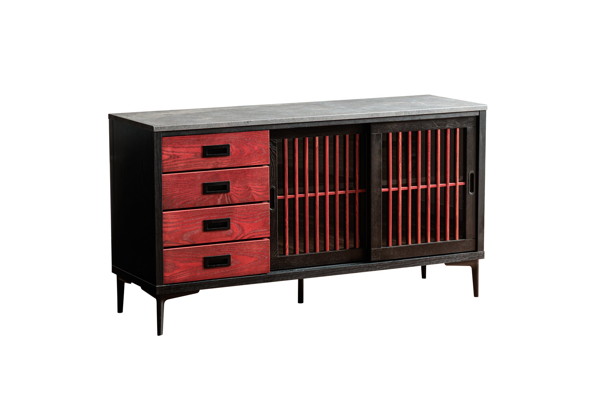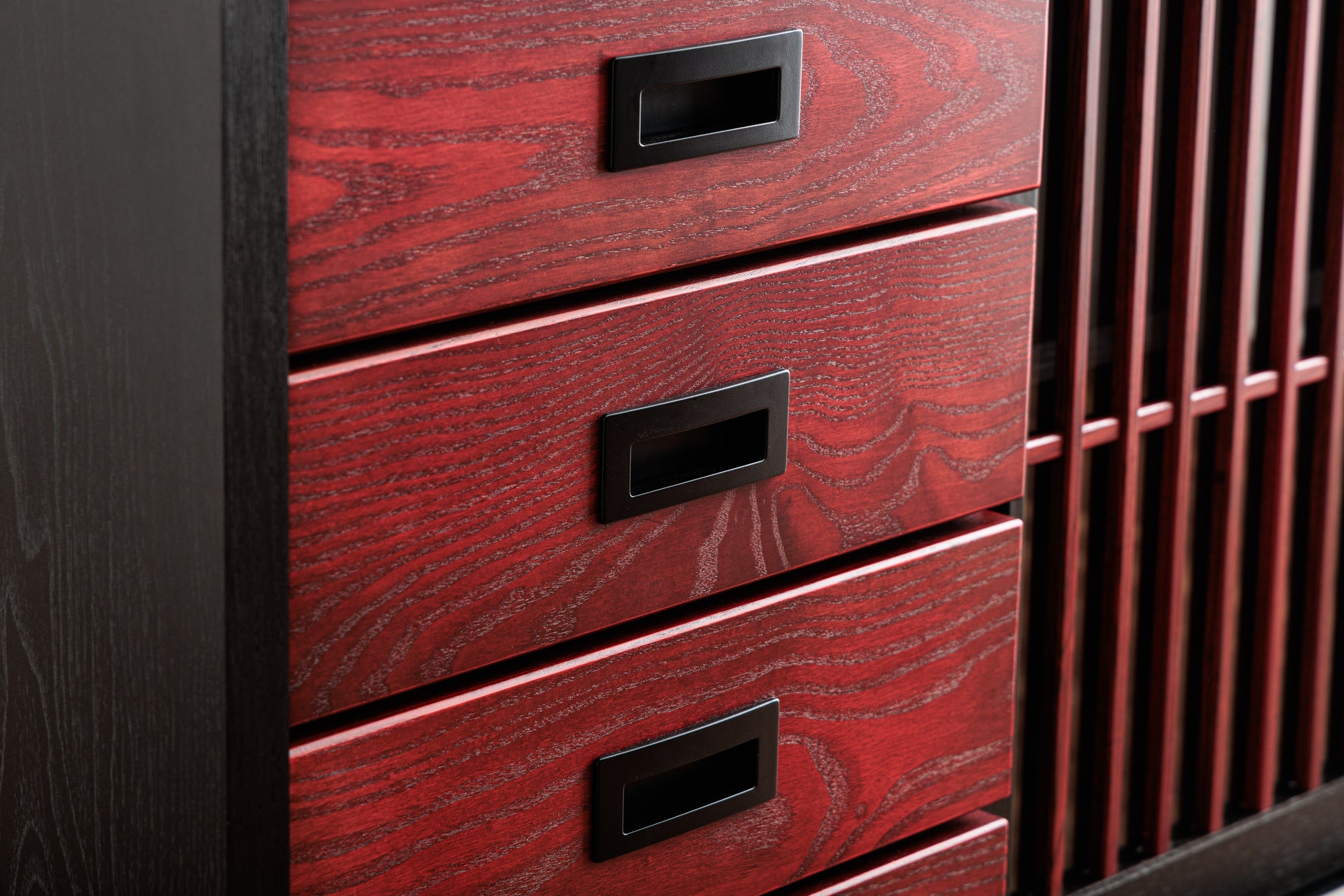 藍色や深紅といった伝統的な日本の色彩を纏い、格子の美しさが際立つ洗練されたサイドボード。